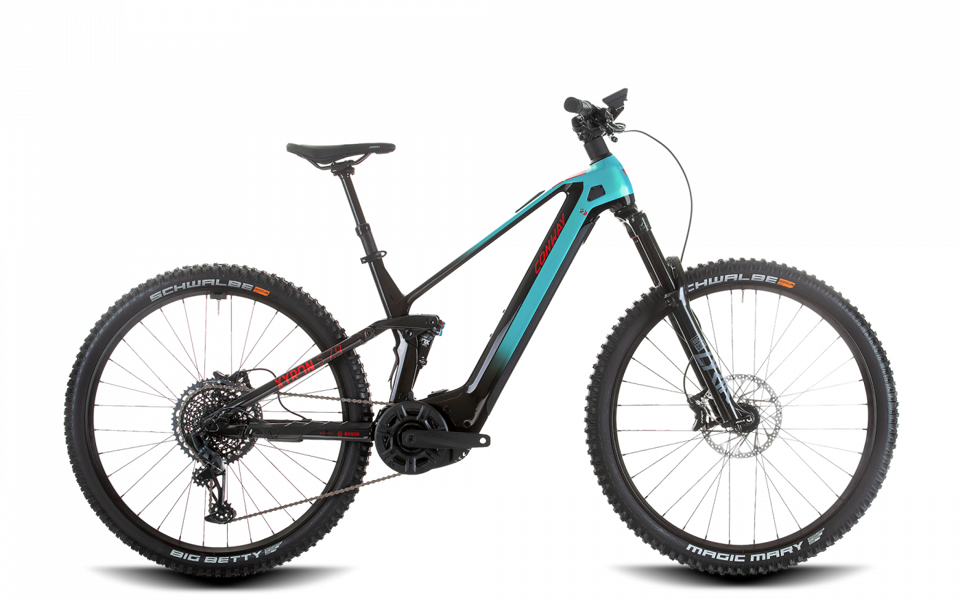 – De Xyron (rechtsonder), met 150mm veerweg, wordt aangedreven door een Bosch Performance CX Smart motor met een 750wh accu.